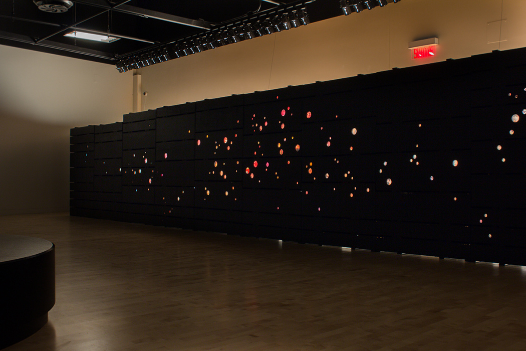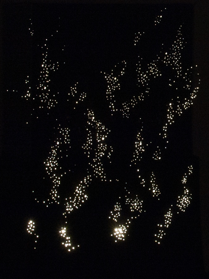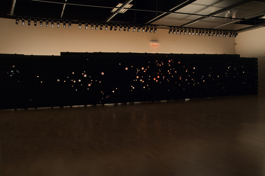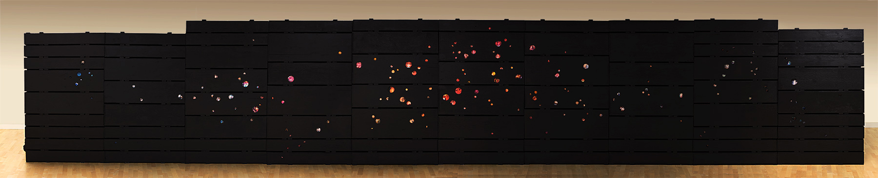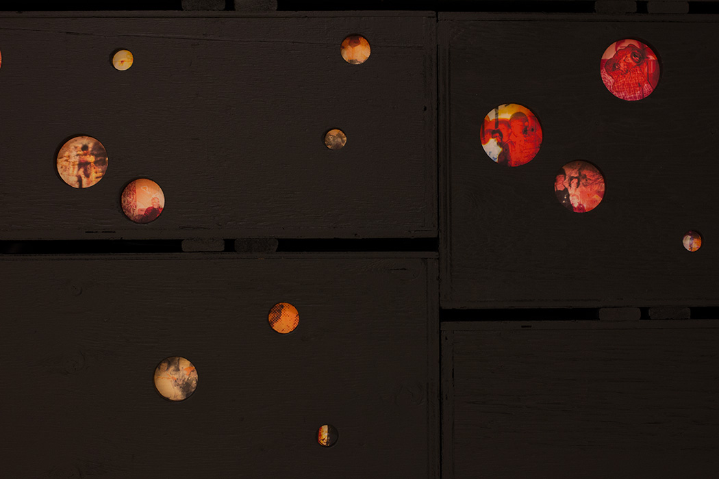 We work mainly with found objects and recycle them. We seek to discover the poetic and sensual potential hidden within images, objects and words which we collect here and there. For this current exhibition, we have reused a number of the dozens of wood crates which were used to transport the collections of the Musée des maîtres et artisans du Québec to the new Reserve located in the basement of the Bibliothèque du Boisé. Using this material, we conceived a wall of images in the form of a ‘constellation’. We recreated a number of miniature scenes which evoke the fragmentary and mysterious way in which memory builds, deforms and recreates past experiences.