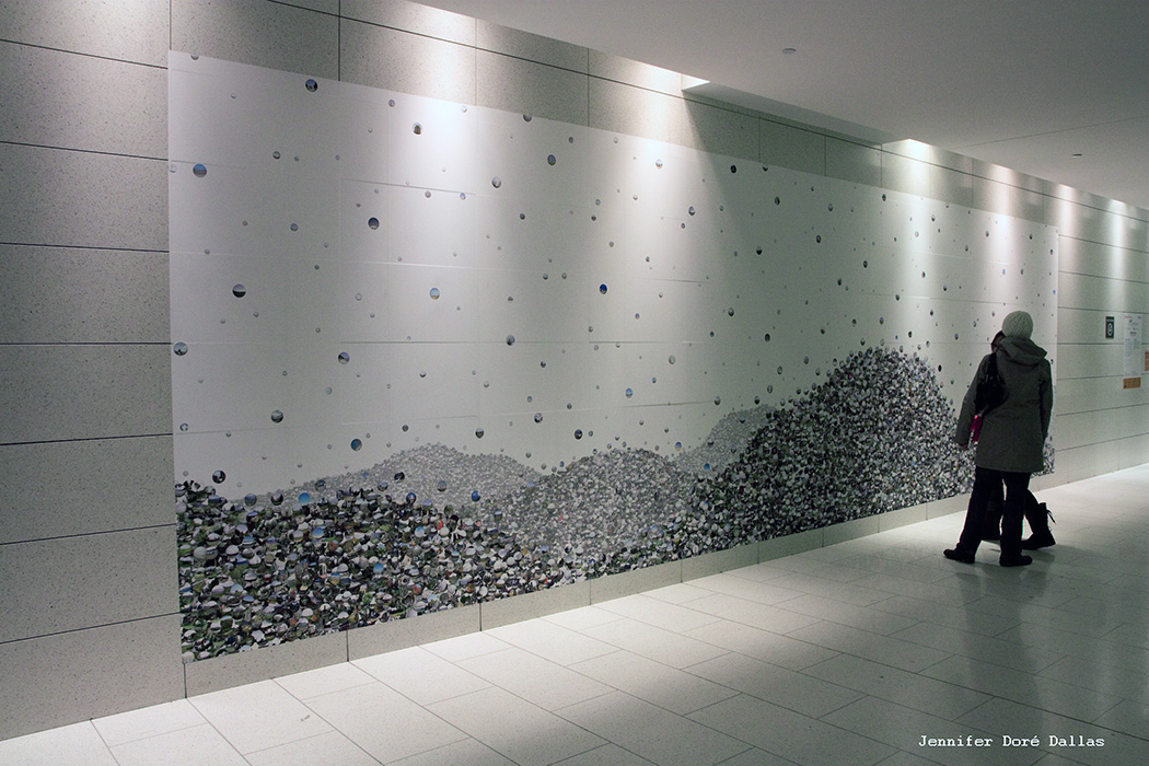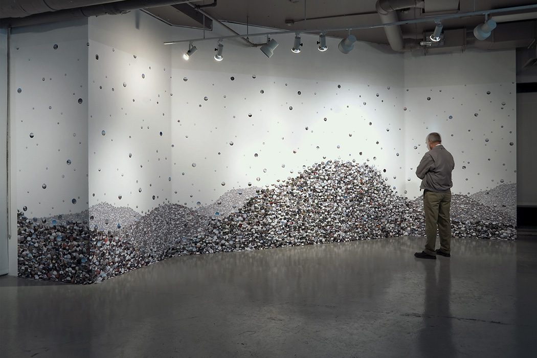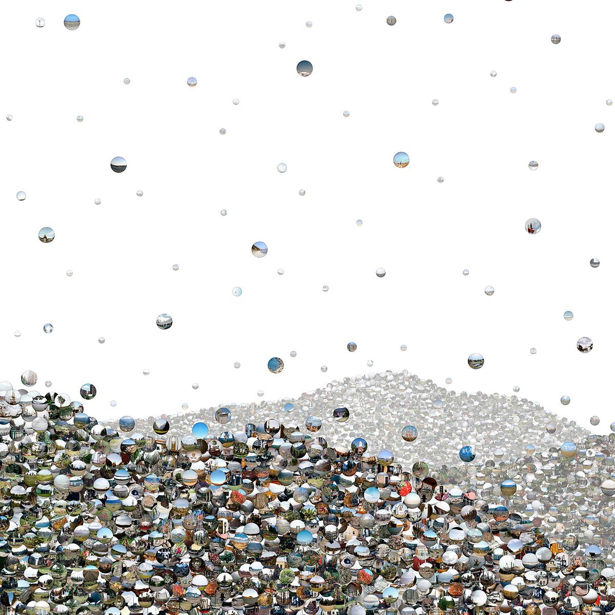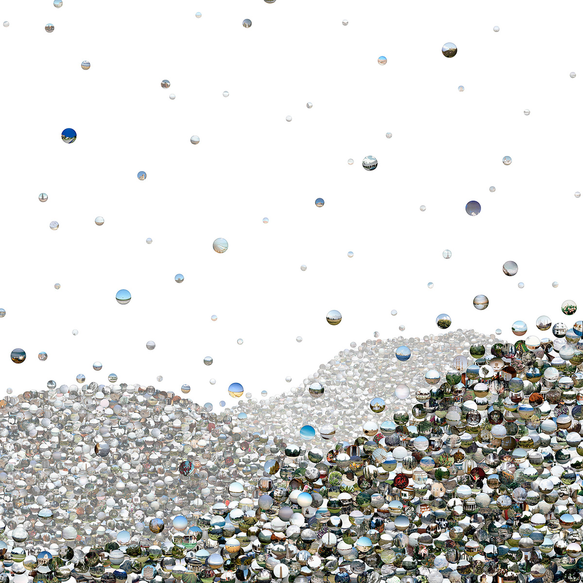 With over one thousand six hundred amateur photographs, scanned and reworked by different softwares, I bring viewers to think about the overflow of images in our societies. If families used to bequeath their images from one generation to another, this is no longer the case today; they now sell in batches on the web. We now prefer the instantaneity of our cell phone than to archive collective and family memories. Hence piles of spheres reminiscent of dumps of our post-industrial societies. But come closer, spheres shimmering effects invite us to contemplation. Are we facing a bucolic landscape or a mound of wastes? Your turn to decide.